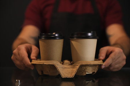 Barista putting takeaway coffee cups with cardboard holder on glass table, closeup