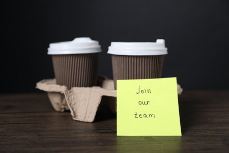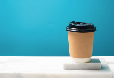 Coffee paper craft cup stands on wooden surface on a blurred background. Place for text