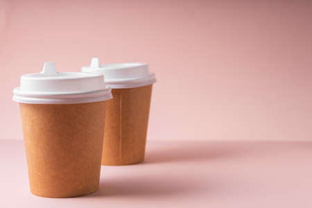 Two paper disposable cups for hot coffee and tea on pink green background .Concept and trend of takeaway food