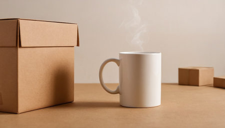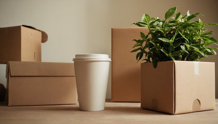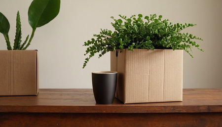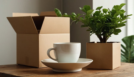 A cozy workspace featuring a cardboard box with a plant and a coffee cup on a wooden table, creating a welcoming atmosphere.