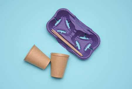 disposable brown paper cups, wood sticks and paper tray on blue background. Takeaway beverage container, top view