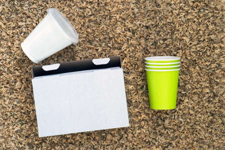 White cardboard box, plastic Cup and paper cups on the background of organic texture of dry petals.