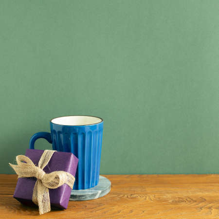 Purple gift box and blue mug cup on wooden table. green background. copy space