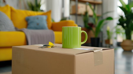 A bright and cozy living room featuring a green mug placed on an open delivery box, surrounded by indoor plants and a vibrant yellow couch.