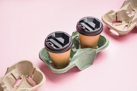 stack of brown disposable paper cups and a stand on a white table, green background. Utensils for takeaway drinks, zero waste
