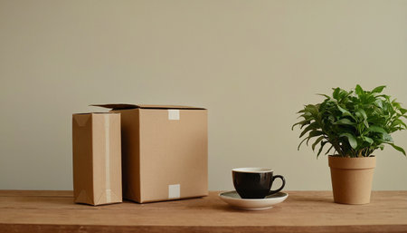 Cardboard box with coffee cup and plant on wooden table with copy space