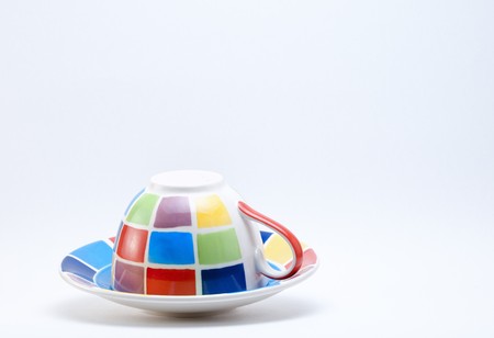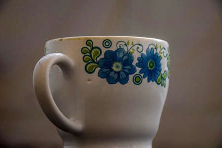Stock photo of white color ceramic tea cup isolated on blur background. blue color flower with green color leaves design on cup. Picture captured at Bnaglore, Karnataka, India. focus on object.