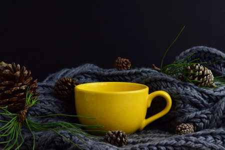 Yellow mug, on woolen cloth, pine cones in outline, season, winter concept.