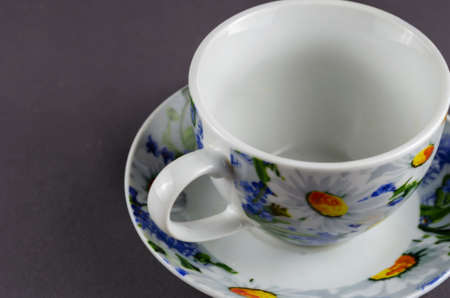 White cup with painted flowers on a gray background. Ceramic Mug cup and saucer for tea or coffee brightly decorated in blue and yellow colors. White daisies on the dishes.