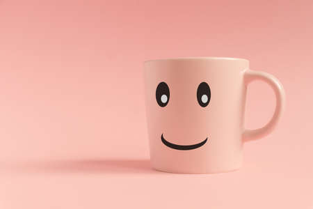 Pink cup on pink background. Smiling face on a mug. Minimal creative concept.