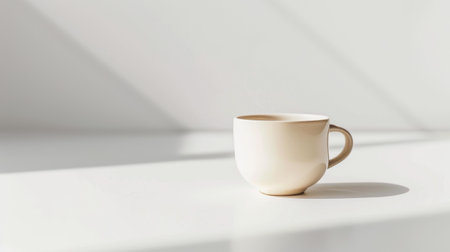 A single beige coffee cup sits on a white surface, casting soft shadows in natural light. This minimalist composition is ideal for themes of simplicity, relaxation, and modern lifestyle.