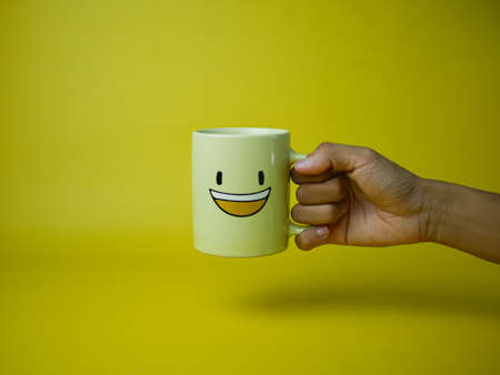 hand holding yellow coffee mug with smile emoticon icon. concept, happy and optimistic to start the day. morning spirit. Good morning