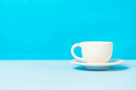 Empty coffee or tea white cup with yellow on yellow background. Copy space.