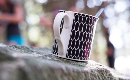 A cup of coffee was placed on the ground in a public garden that was used for exercise with soft fair lighting. overlooking the sky and trees