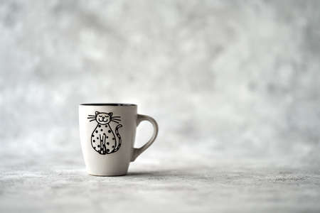 Gray ceramic cup with a cat pattern on a gray-white textured background. Copy space.