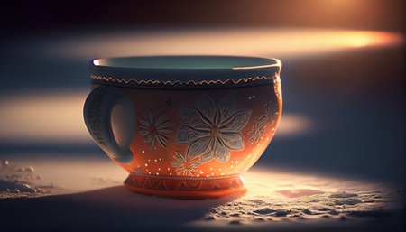Hot coffee in wood mug, winter night generated by artificial intelligence
