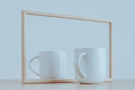 Close up white coffee cup on wood table and view of sunset or sunrise background beauty