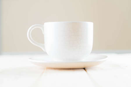 Coffee cup in morning sunlight. Summer fresh cool look. White coffee cup on saucer for hot drink on roof beam of a residential building with bokeh background.