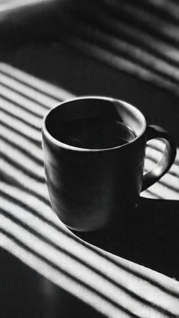Black coffee cup on table with shadow from blinds. Black and white photo.
