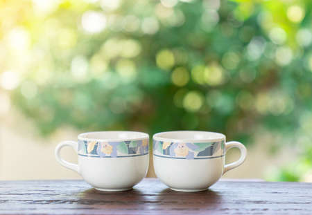 Coffee cups on wooden table and copy space text on green plant blur background.