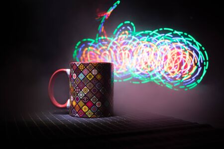 Beautiful eastern style textured ceramic cup of coffee (or tea) with smoke over dark toned background. Close up view.