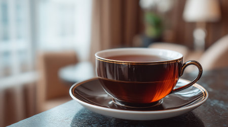 A cup of tea sits on a table in a cozy living room with a blurred background