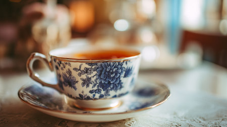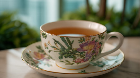 A delicate floral teacup filled with tea on a matching saucer in a serene setting