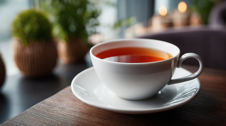 A cup of tea sits on a saucer in a cozy cafe atmosphere
