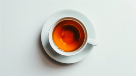 White ceramic cup filled with hot tea, placed on a white surface. Top-down view, perfect for food, beverage, health, wellness, and lifestyle concepts. Simple and elegant composition.