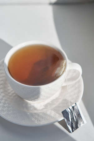 breakfast concept. white embossed cup of tea coffee on white background, sunlight morning, hard shadows. side view, horizontal photo, copy space, minimalism