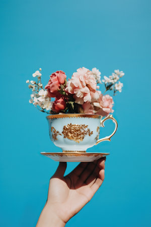 A picture of a hand holding a tea cup and saucer. This image can be used for various purposes, such as illustrating tea parties, relaxation, or enjoying a hot beverage.