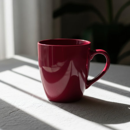 Warm burgundy ceramic mug bathed in soft sunlight and shadow patterns on a table