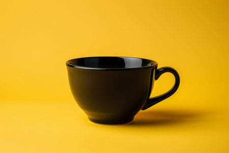 Matte black coffee cup with sharp shadows on white. Clean lines and texture highlight minimalist elegance.