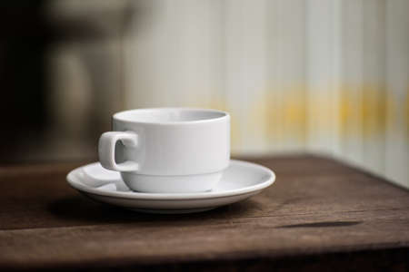 Cup of coffee on wood table in the morning