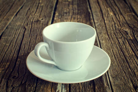 White cup and saucer on wooden table