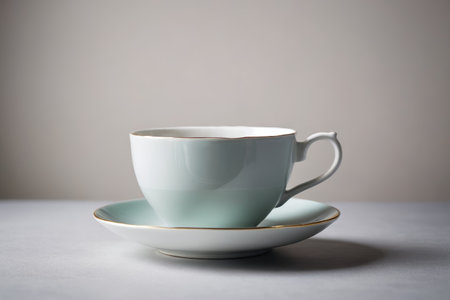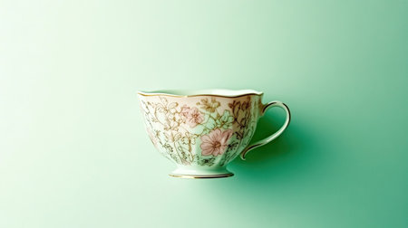 photo of a delicate porcelain teacup with intricate floral designs, placed on the lower center of a pale mint green background. Subtle lighting highlights the details while leaving the top open for text, isolated on pale mint green background --no people man woman --chaos 12 --ar 16:9 --style raw --stylize 250 --weird 150 --v 6.1 Job ID: 45de74bd-cf4e-422d-8473-b9f9ab451e60
