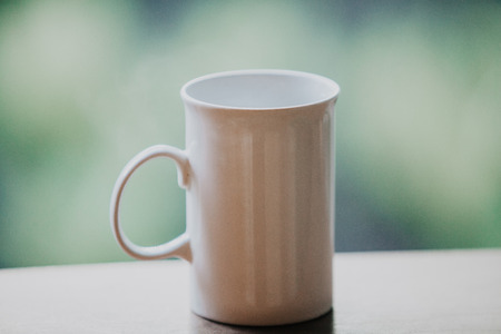 Strict high white cup with comfortable handle on a green blurred background