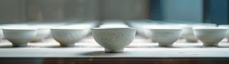 This image captures a serene and symmetrical arrangement of Chinese ceramic tea bowls on a light wooden surface. The bowls feature a minimalist design with delicate speckles, and one is in sharp focus while the others gradually blur into the background, creating a sense of depth and tranquility. Perfect for themes of minimalism, tea culture, ceramics, and the beauty of simplicity.