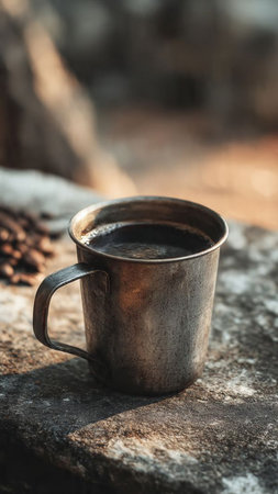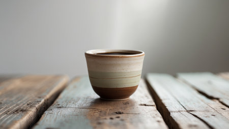 AI Generated. Sipping dark roast coffee in an artisan ceramic cup on a rustic wooden table soft natural light enhancing the experience