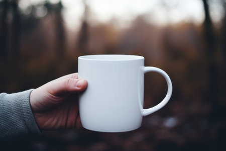 A solo blank white coffee mug on the hand of the man at the great salt lake state park.