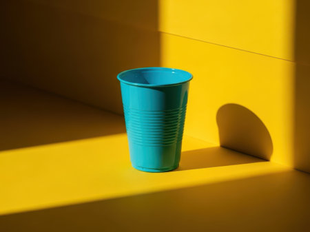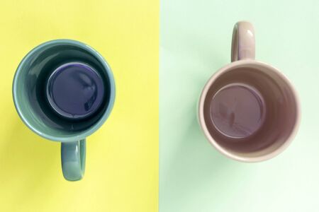Colored cup on an empty colored background, minimal concept background. Home cookware and morning idea