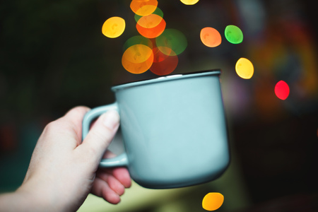 a cup in the hand . Christmas bokeh