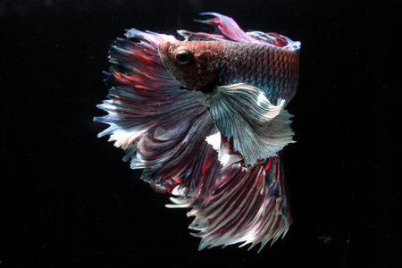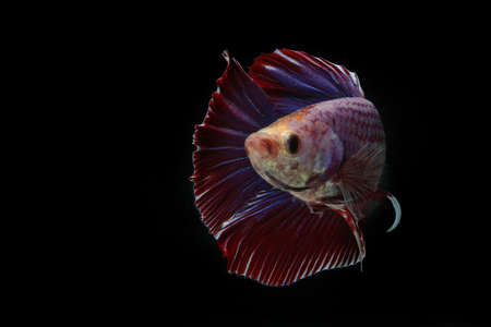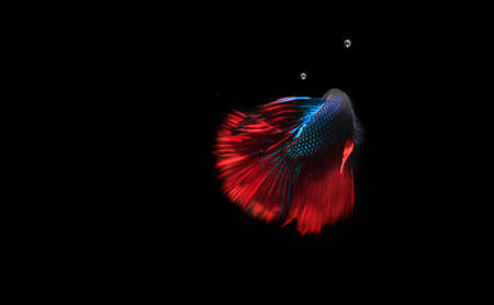Halfmoon Betta splendens fighting fish in Thailand on isolated black background. The moving moment beautiful of blue and red Siamese betta fish with copy space.