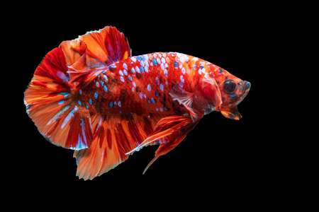 Multicolor Betta splendens fighting fish in Thailand on isolated black background. The moving moment beautiful of orange Siamese betta fish with copy space.