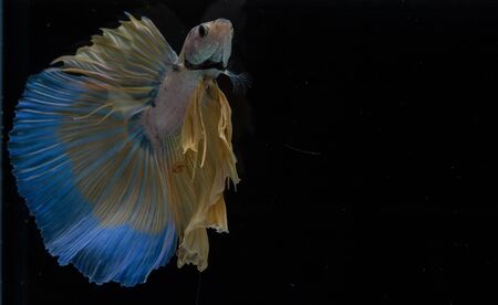 The movement white, yellow, blue halfmoon betta splendens fighting fish on isolated black background with clipping part. The moving moment beautiful of white Siamese betta fish with copy space.