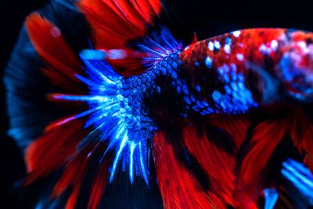 Close-up moment fish betta halfmoon blue red stripes black background scenes
