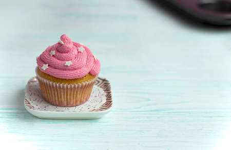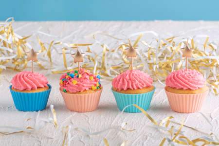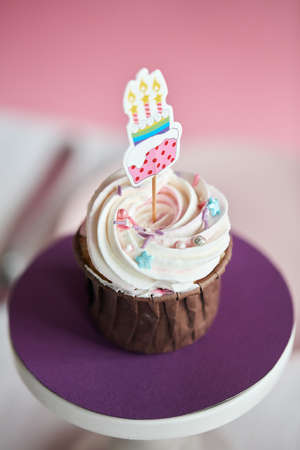Muffins with pink buttercream frosting with candle in the shape of star. Delicious party food