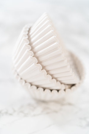 Empty white paper baking for muffins and cupcakes on gray background.