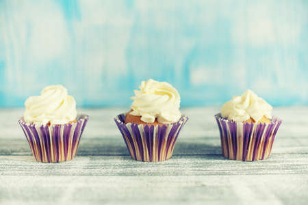 Delicious vanilla mousxes with pink cream. Three homemade muffins on wooden. Copy space. Birthday cupcake on light background