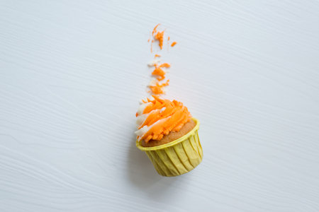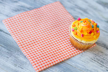 Cupcake with orange frosting on a white wooden background.